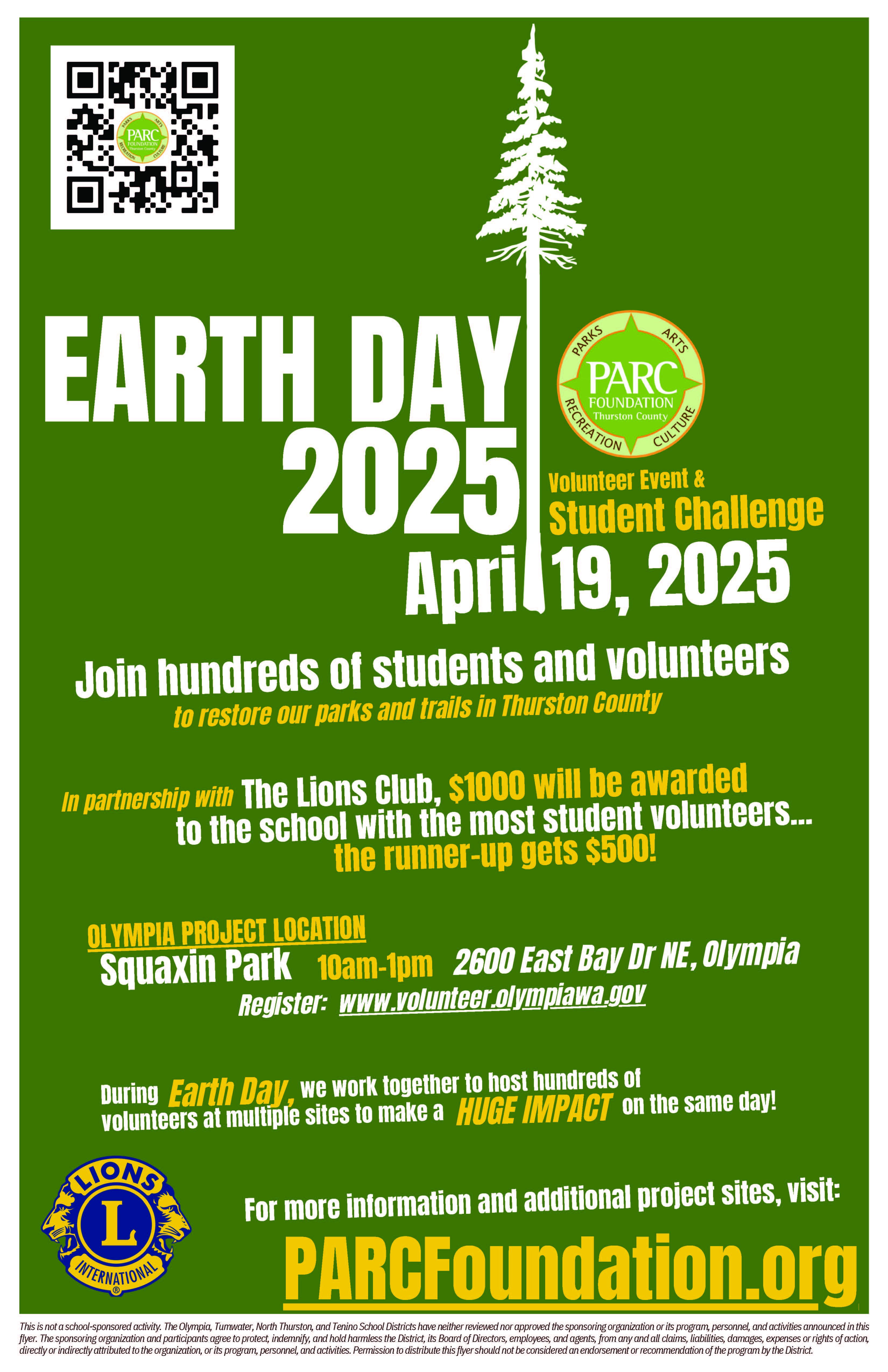 Show your support for Earth Day by participating in a restoration project at Squaxin (formerly Priest Point) Park! The City of Olympia is teaming up with the PARC Foundation of Thurston County and local Lions Clubs to celebrate Earth Day in style with a fun and exciting volunteer work party. Thanks to Lions Club donations, the school with the most student volunteers will win cash for their school! Tools, gloves, and light refreshments will be provided. Register today for this free event and show your support!