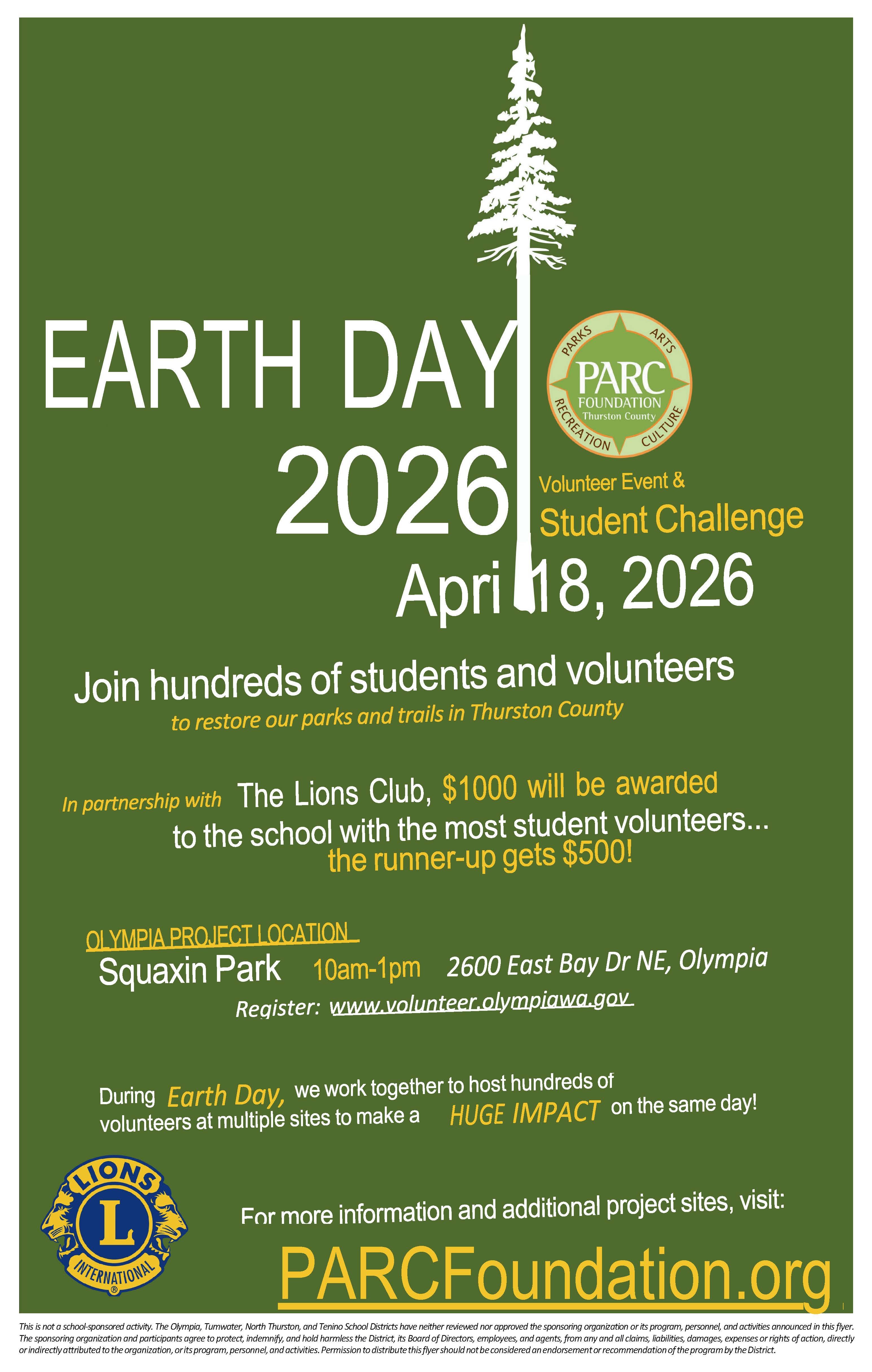 Show your support for Earth Day by participating in a restoration project at Squaxin (formerly Priest Point) Park! The City of Olympia is teaming up with the PARC Foundation of Thurston County and local Lions Clubs to celebrate Earth Day in style with a fun and exciting volunteer work party. Thanks to Lions Club donations, the school with the most student volunteers will win cash for their school! Tools, gloves, and light refreshments will be provided. Register today for this free event and show your support!
